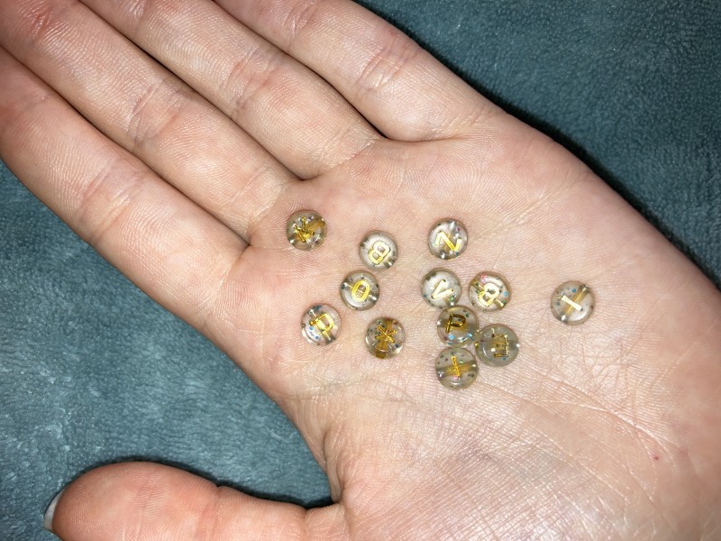 Chaque perle transparente est ornée de paillettes colorées qui lui donne un esprit festif et pétillant. Notez aussi que les lettres dorées sont gravées sur les deux faces de vos perles rondes.