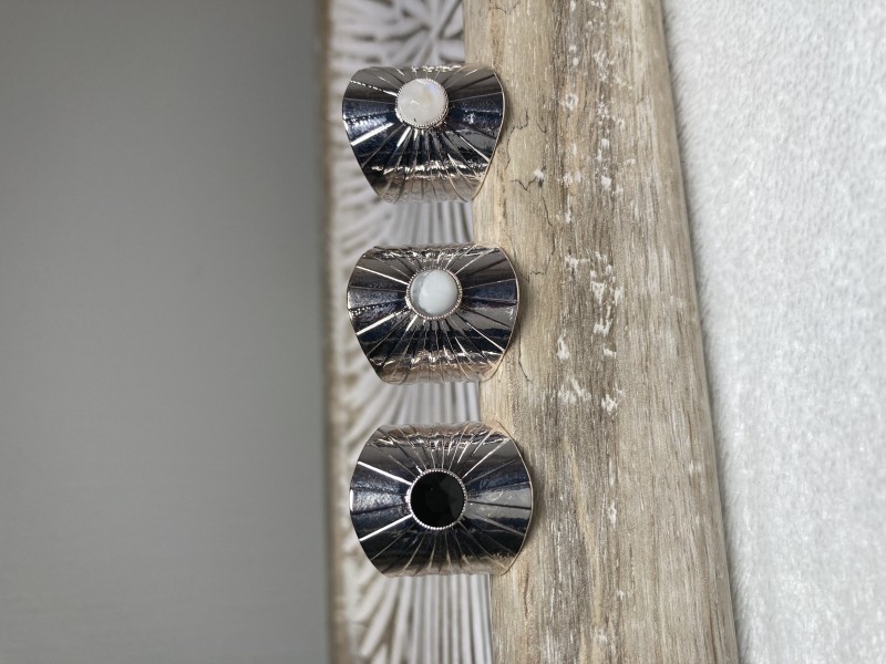 Bague large réglable en laiton recouvert d'une finition en argent fin (99.9% d'argent) d'une épaisseur d'environ 0.5 microns.