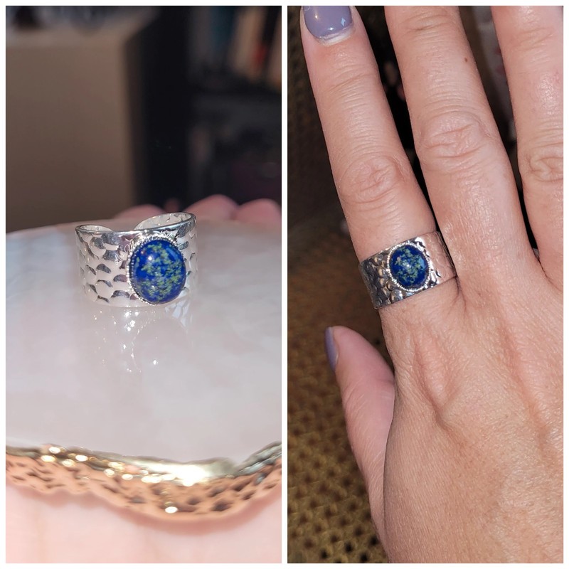 Cette bague réglable en laiton est recouverte d'une finition argentée. Son anneau large martelé n'est pas fermé pour pouvoir l'ajuster facilement à votre doigt.