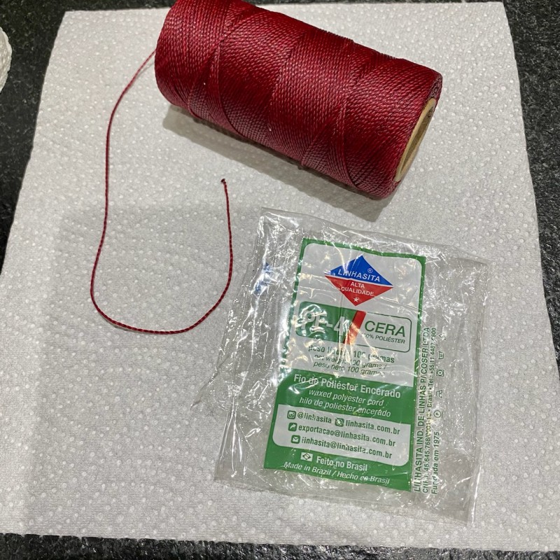 Le fil ciré brésilien Linhasita est fait de 4 brins de polyester ciré, enroulés ensemble pour former un fil de 1 mm de diamètre. Cette technique le rend solide, résistant aux moisissures et lavable.