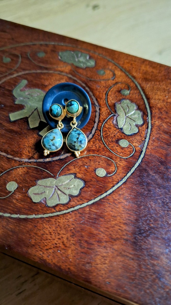 Laissez-vous séduire par ces clous d'oreilles en Argent 925 (92.5% d'argent) avec une finition Doré à l'Or fin 24K ! Raffinés et élégants, ils sont sertis d'une pierre gemme Turquoise Africaine. De plus, ils sont munis d'un anneau ouvert pour vous permettre d'y accrocher tout ce dont vous avez envie. À vous les jolies boucles d'oreilles pendantes.
