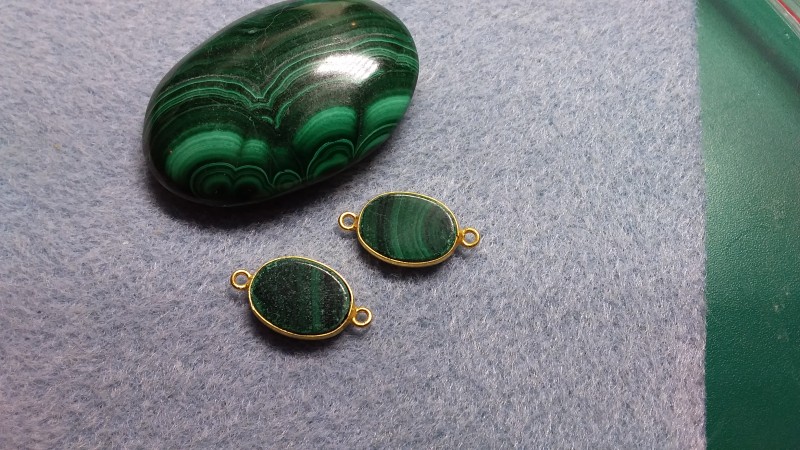 Cet intercalaire ovale en Argent 925 est recouvert d'une finition doré à l'Or fin 24K. Il est serti d'une pierre gemme plate en Malachite.