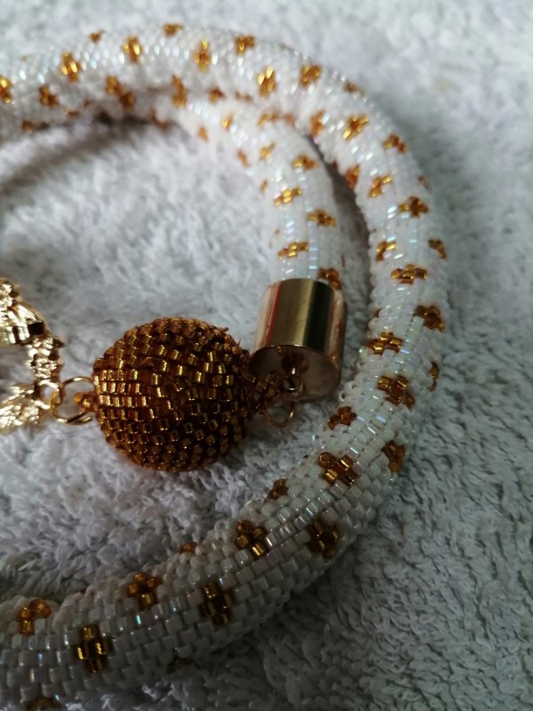 La couleur est lumineuse, je l'utilise dans quasiment tous mes projets de couleur froide: avec du bleu, du rose, du gris... C'est une couleur douce, neutre, qui équilibre les autres couleurs (surtout que j'utilise essentiellement des perles galvanisées, donc avec un aspect métallique).
