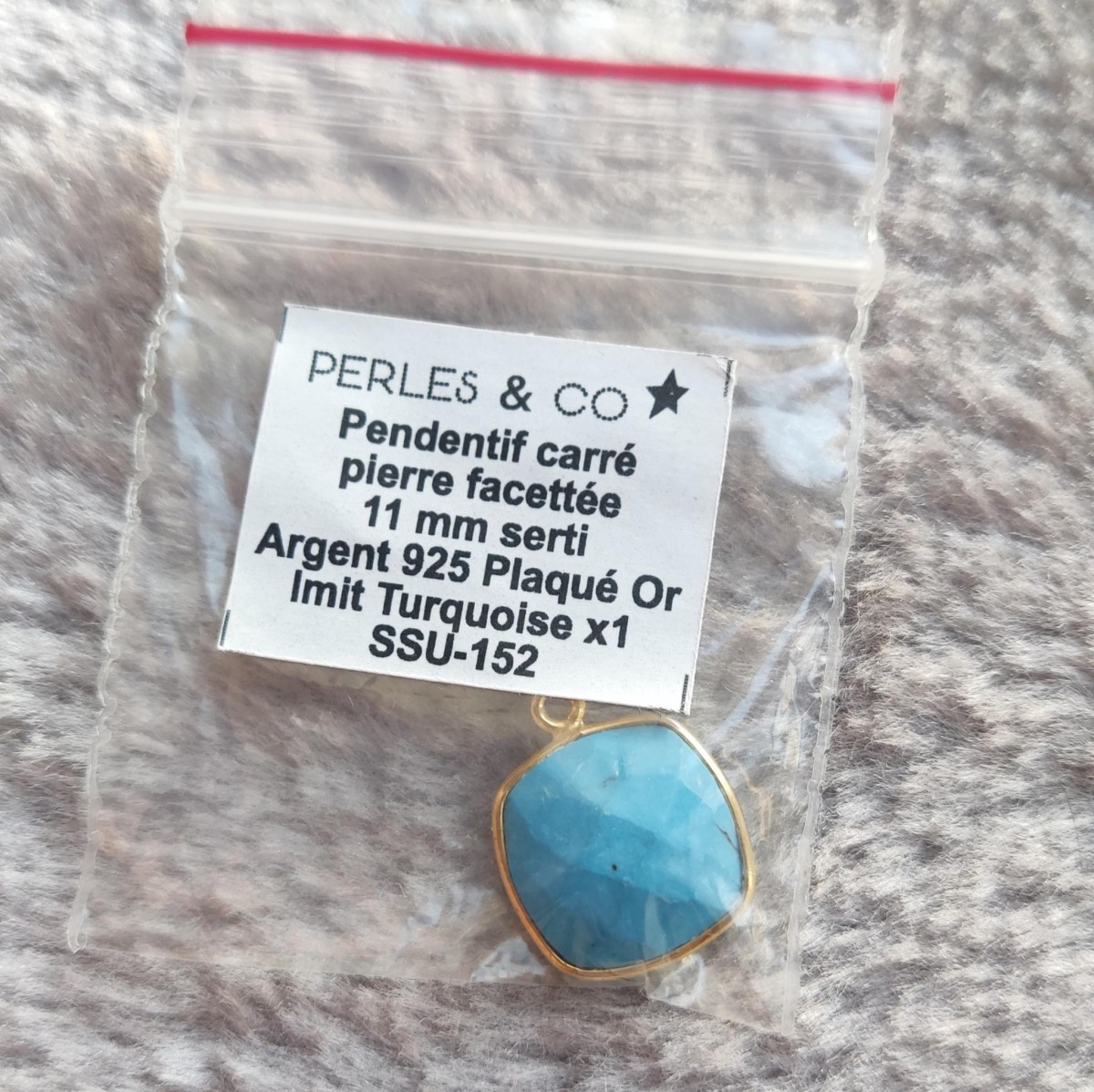 Pendentif en Argent 925 plaqué or 3 microns avec une pierre carrée facettée imitation Turquoise de 11 mm.