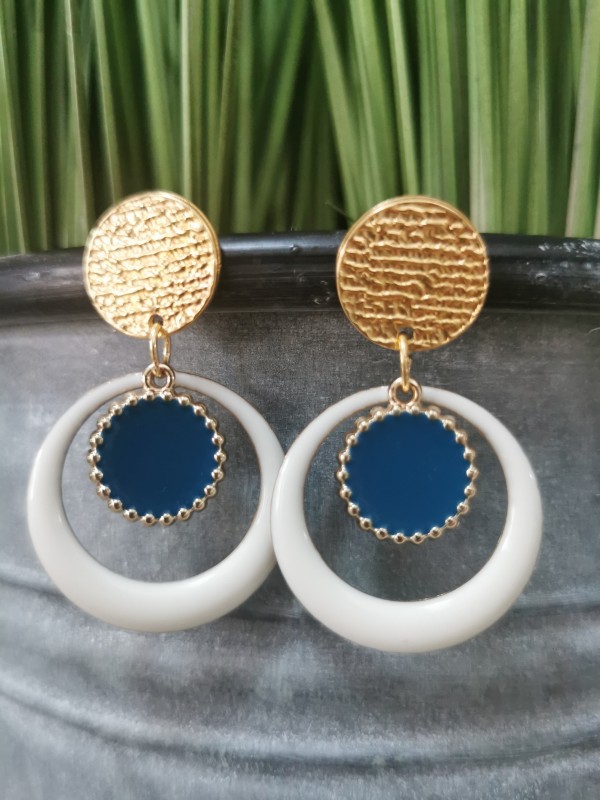 Ces pendentifs en forme de créole sont en laiton recouvert de résine époxy blanche sur les deux faces.