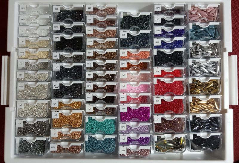Plateau de rangement et son assortiment de boites de la collection Bead Storage Solutions créée par Elizabeth Ward, spécialiste en vente de perles depuis plus de 25 ans.