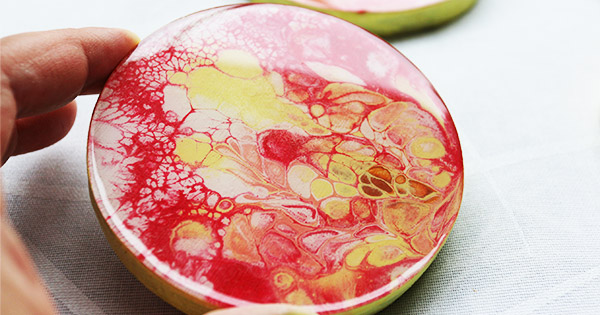 Une fois ceci fait, on vient couler la résine sur nos supports. Auto lissante, la résine va s'étaler d'elle-même et joliment aplanir nos surfaces. On peut l'aider un petit peut en s'aidant des touillettes ou en bougeant les supports.