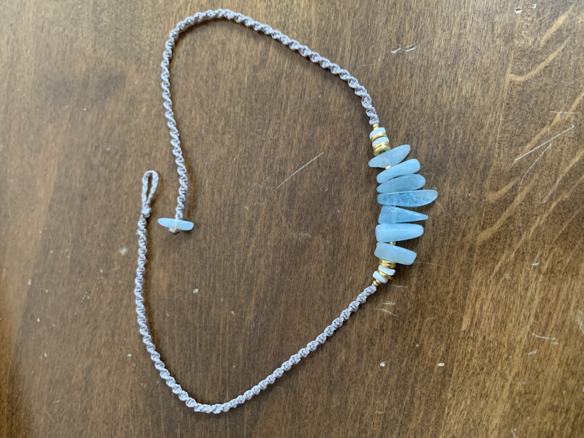Créez votre fermoir en passant dans le fil sur un des côtés une des perles que vous avez mis de cotées au début, le mieux serait d'en avoir une ou le perçage se situe au centre de la pierre. Passez les deux autres fils autour de la pierre de manière à pouvoir faire un nœud avec les 3 fils.