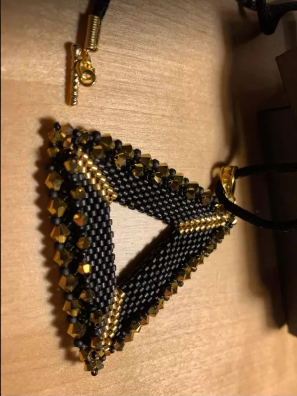 Commencez par enfiler 15 perles Miyuki Délicas 11/0 noires (DB11), puis 2 DB11 de couleur dorée et répétez la démarche 3 fois. Repassez le fil dans les 16 premières perles pour faire une boucle. Votre fil doit ressortir au niveau de la 1ère perle DB11 dorée