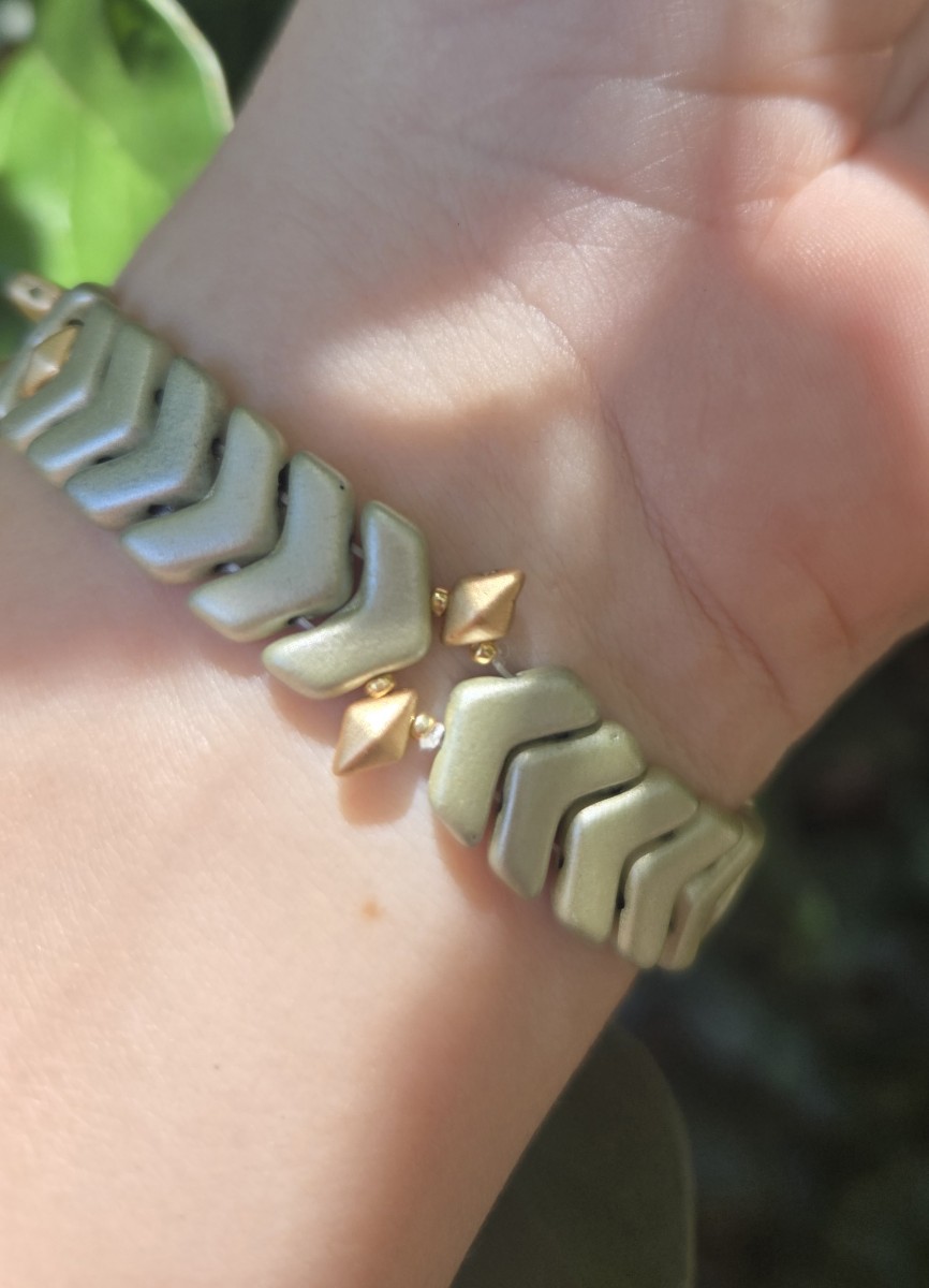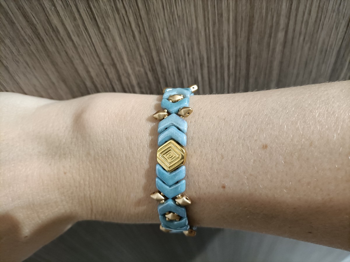 Alignez toutes les perles et les apprêts sur la table pour mesurer la longueur du bracelet. Ajustez le nombre de perles. Par exemple, sur la photo, la longueur du bracelet est d'environ 14 cm, ce qui est parfait pour un poignet entre 14,5 et 15 cm car il faut encore ajouter le fermoir et la chaînette d'extension.