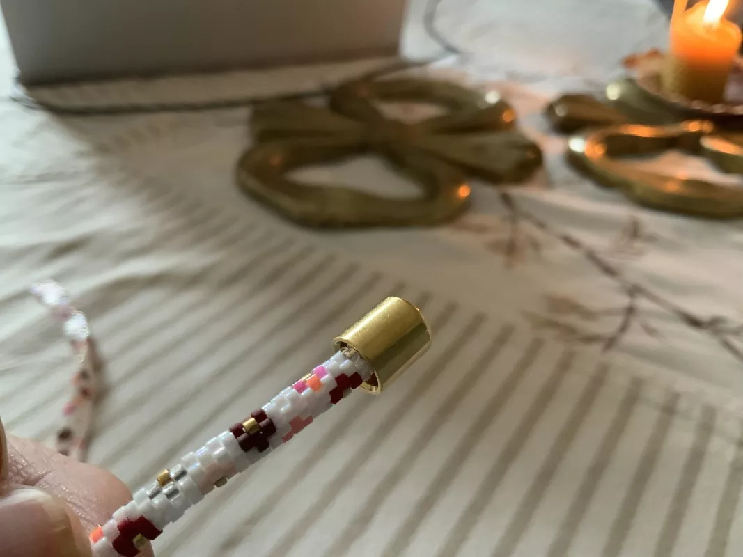 Placez une perle d'arrêt. Pour cela enfilez une perle (une couleur non présente dans votre tissage, afin de ne pas la confondre) et repassez dans celle-ci. Cette perle sera retirée une fois le tissage terminé.