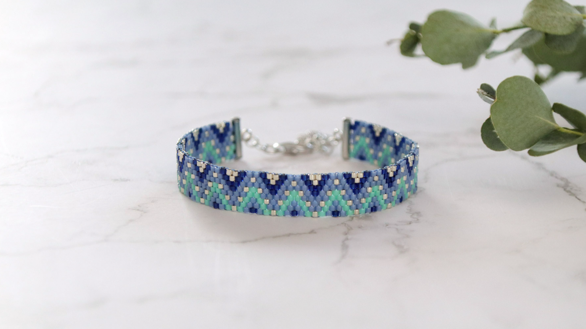 Coupez 1,5 m de fil de tissage et enfilez-le sur une aiguille taille 12. Enfilez les perles suivantes : 2x DB-2191 bleu foncé, 3x DB-0266 bleu, 1x DB-1831 argenté, 2x DB-2125 vert d'eau. Elles correspondent au 2 premiers rangs du tissage. Barrez les perles sur le schéma au fur et à mesure que vous les enfilez.