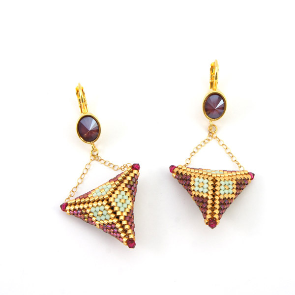 Apprenez très facilement avec cette vidéo illustrée comment réaliser une paire de boucles doreilles triangulaire en 3D tissée en peyote avec des perles Miyuki Delicas et des toupies Swarovski.