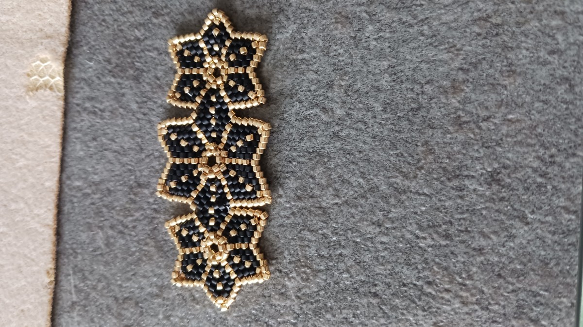 Continuez à tisser en suivant le schéma de l’étoile peyote. Attention ! Les deux étoiles sur les côtés sont plus petites.