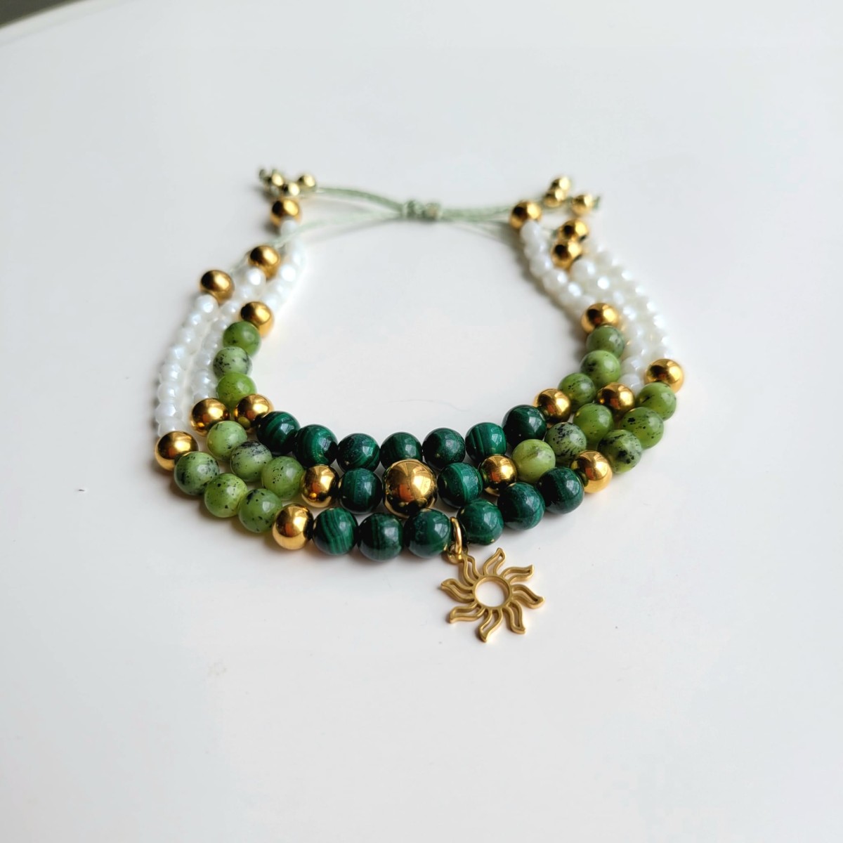 Fabriquez un bracelet avec des perles en Malachite et Aventurine. C'est un bracelet multirangs qui donnera l'illusion de porter plusieurs bracelets en pierres en accumulation. La malachite est une pierre qui a traversé les âges, largement utilisée dans l’Antiquité pour des ornements et des sculptures. Connue pour ses motifs en couches vertes, elle a souvent été utilisée dans les bijoux des civilisations égyptienne et grecque. Son apparence marbrée apporte un côté mystérieux à une tenue automnale. Quant à l’aventurine, elle offre une teinte plus douce qui se marie parfaitement avec la malachite.