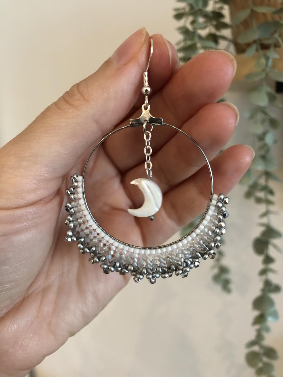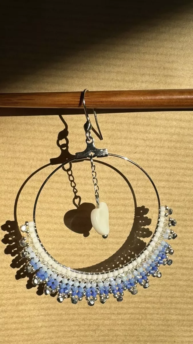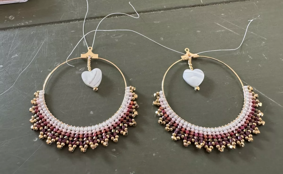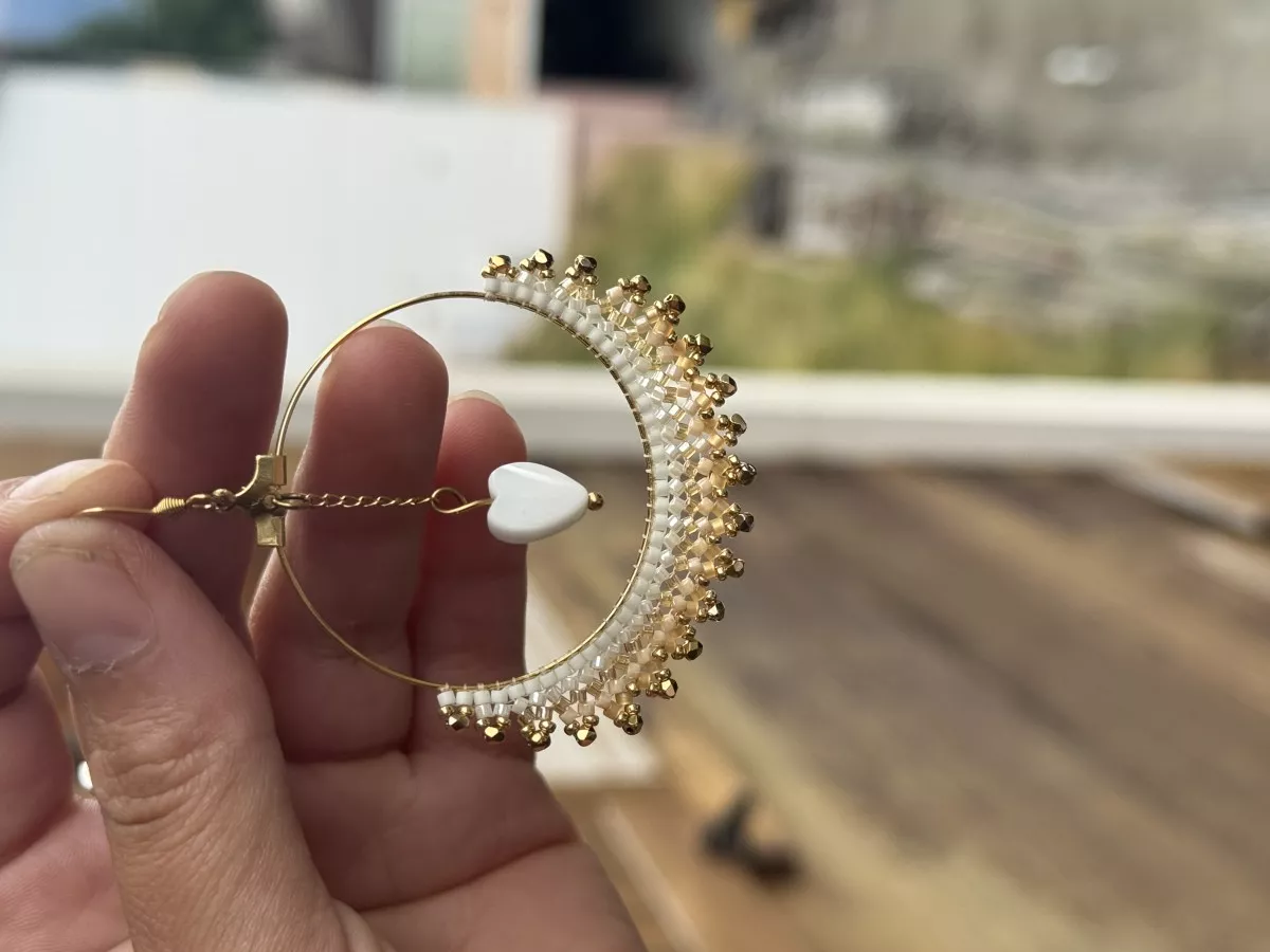 Redressez le bout du fil métallique de la créole, au dos, avec une pince plate pour éviter que la créole ne s'ouvre pendant le tissage. Coupez environ 1,5 m de fil fireline 0,10 mm et enfilez-le sur une aiguille taille 12. Faites un double noeud sur votre créole à l'endroit où vous souhaitez commencer votre tissage. Gardez 20 cm de bout de fil. Pour faire votre premier rang en brick stitch, enfilez deux perles DB-0352 puis faites passer l'aiguille sous la créole pour la faire ressortir par le centre. Repassez ensuite l'aiguille dans la deuxième perle enfilée. Serrez bien afin de placer les perles perpendiculairement à la créole. Passez à nouveau dans la première perle, puis dans la deuxième et serrez pour redresser les deux perles.